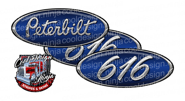Style and protect your factory hood emblems with a set of custom Peterbilt Emblem Skins. Printed on 3M Scotchcal vinyl then laminated for a 7+ year road life.